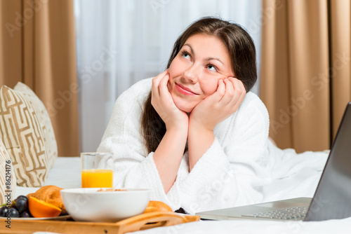 lifestyle, indoor, woman, adult, computer, bed, beautiful, laptop, pensive, bedchamber, white, comfortable, smiling, leisure, activity, cyberspace, only, person, beauty, relaxation, 1, female, happiness, caucasian, young, cheerful, lying, woman, carefree, enjoyment, people, portrait, joy, working, meal, business, breakfast, technology, positive, ecstatic, hotel, drink, food, dream, happy, domestic, tray, bathrobe, business trip