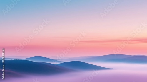Dreamy misty mountain landscape at dawn with soft pastel hues and layered hills. Peaceful nature scene