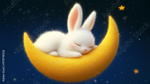 Dreamy Nights: Fluffy White Rabbit Sleeping on a Crescent Moo