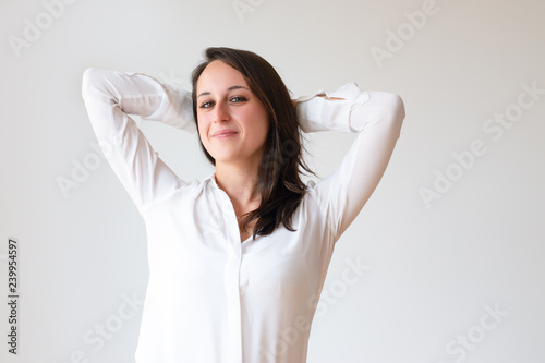 person, female, woman, girl, caucasian, young, adult, casual attire, blouse, shirt, long, hair, model, portrait, concept, studio, isolated, white, background, smiling, happy, cheerful, positive, joyful, serene, calm, peaceful, relaxed, lazy, looking, camera, office, men at work, employee, vacation, leisure, time, resting, dreaming, thinking, planning, leaning, nap, hand, copy space, advertising