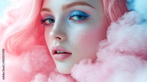 Dreamy Pastel Portrait Beautiful Woman with Pink Hair and Blue Eye Makeup in Cloud.