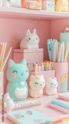Dreamy pastel workspace featuring cute animal-shaped erasers and kawaii stationery on a soft pink desk