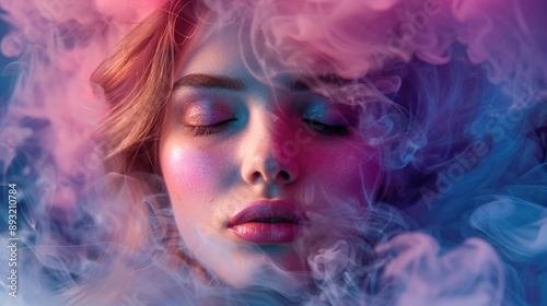 Dreamy portrait of a woman with closed eyes surrounded by colorful pink and blue smoke, creating a surreal and ethereal atmosphere.
