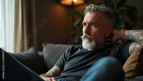 dreamy, relaxed, mature, older, thoughtful, tattooed, hipster, man, sitting, thinking, home, pensive, calm, stylish, single, bearded, guy, resting, couch, looking away, reflecting, design, lifestyle, relaxation, fashion, beard, casual attire, comfortable