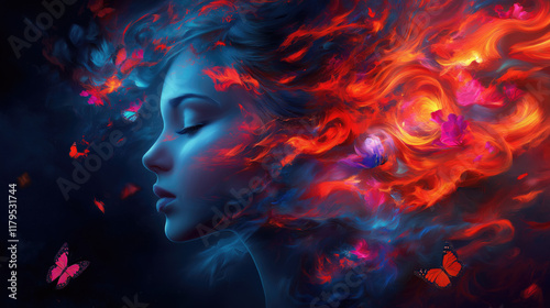 woman, vibrant, fiery, hair, butterfly, dreamlike, surreal, colourful, artistic, fantasy, aethereal, flow, glowing, flames, nature, mystical, beauty, peaceful, gentle, calmness, delicate, dream, harmony, art, passion, magic, day, fusion, inspiration, spring, abstract, wonder, elegance, joy, dreamy, march, creative, allure, wonders, vision, transformation, captivating, imagination, international, serenity, 8