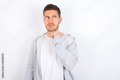 Dreamy young caucasian man wearing casual clothes over white background with pleasant expression, looks sideways, keeps hand under chin, thinks about something pleasant.
