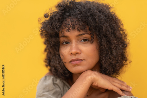 woman, thinks, thoughtful, piercing, pensive, serious, human face, curly hair, model, casual attire, fashion, accessory, dreamy, thought, look, portrait, appearance, alone, head shot, daydream, quiet, peaceful, vision, lady, young, female, style, coiffure, decision, facial, mood, wavy hair, mulling, emotionless, doubt, lonely, serene, mind, curl, personality, looking away, yellow background, inside, black, african american, ethnic