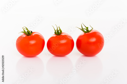 drei frische rote Tomaten mit Stengeln vor weißem Hintergund isoliert in Reihe