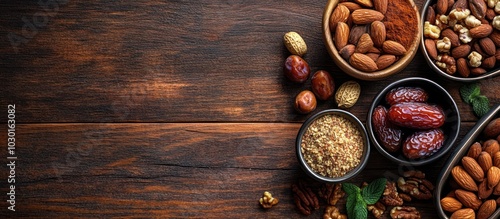 Dried Dates, Almonds, Pecans and Walnuts in Bowls on Rustic Wood Background.