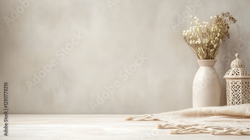 dried, flower, vase, lantern, fabric, white, beige, cream, neutral, minimalist, decor, home, style, rustic, elegant, simple, texture, background, design, arrangement, scene, setting, aesthetic, calming, peaceful, serenity, tranquil, soft, delicate, muted, subtile, light, shadow, room, table, surface, ornament, detail, beauty, image, photo, art