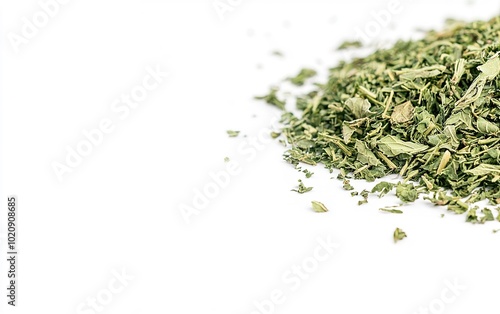 Dried herbs in a mound on a white surface showcasing their vibrant green color and fine texture