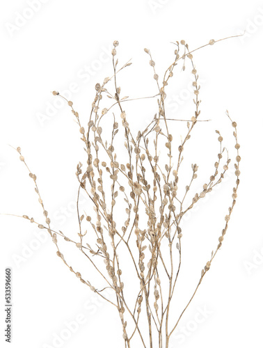 Dried meadow plants isolated on white background. Wild herbs, grasses or flowers in autumn and winter.