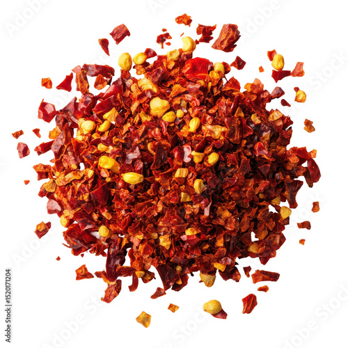 Dried red chili flakes scattered on a white background, ideal for enhancing various dishes and adding spice to meals