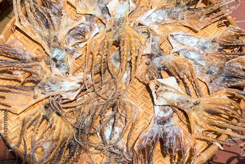 Dried squid on bamboo tray for the ingredients old traditional Chinese Medicine