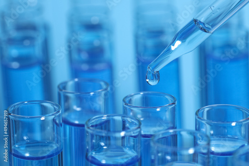 Dripping reagent into test tube on light blue background, closeup and space for text. Laboratory analysis