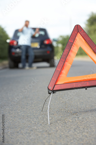 driver, man, car, breakdown, broken down, road, countryside, rural, remote, warning sign, triangle, motoring, vehicle, accident, insurance, hazard, signs, traffic, vertical, transportation, driving, male, caucasian, 40s, 40s, middle-aged, mid-age, mobile, phone, mobile phone, call, calling, phone call, people, person