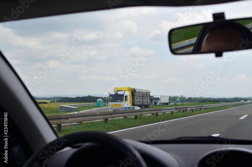 road, car, truck, highway, transport, driving, speed, traffic, transportation, view, drive, route, direction, safety, outside, vehicle, trip, day, travel, auto, glasses, windscreen, journey, automobile, driveway, expressway, asphalt, steering, wheel, motion, man, concept, modern, automotive, destination, location, relocation