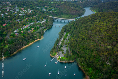 Drone aerial view over suburbs of Northern Beaches in Sydney Australia
