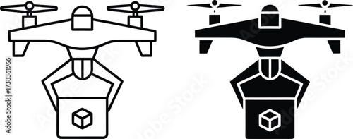 Drone Delivering Package Icon Set Line Art and Silhouette delivery cargo