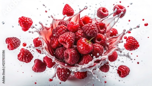 Drone Photography: High Contrast Red Raspberry Burst, Juice Splash, White Background - Stunning Aerial Food Photo