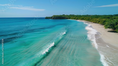 Drone shot of a beautiful tropical beach. The clear blue sea sparkles under the sun, waves gently rolling onto the sandy shore. A perfect scene