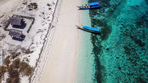 Drone shot of two boats anchored to pink beach on an island near Maumere, Indonesia. There is a fisherman's cottage on the beach, separated by the fence. turquoise coloured water displaying coral reef