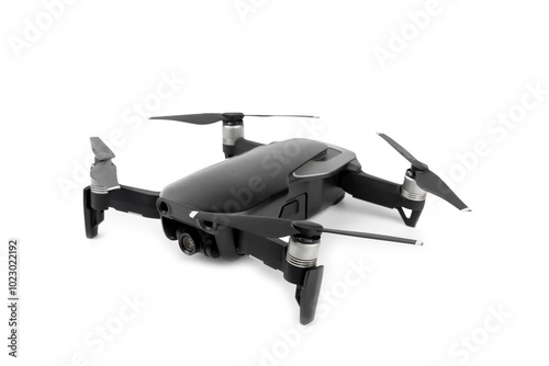 Drone unmanned aircraft isolated on white background. Modern FPV drone on a white background. The drone quadcopter. aircraft on the radio control. Drone for racing, filming and entertainment.
