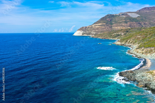 mediterranean sea, corsica, cap corse, aerial view, nature reserve, landscape, ocean, water, beach, blue skies, nature, island, blue, bay, summer, viewpoint, travel destination, vacation, journey, rock, cliff, shore, rock, green, cliff, scenic, seascape, beautiful, idylli, dramatic, panorama, panoramic, france, rough, calmness, tranquil scene, solitude, copy space, background, mountain chain, hill, cumulus, peninsula