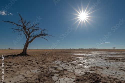 Drought-Stricken Landscape Under Bright Sunlight with Bare Tree