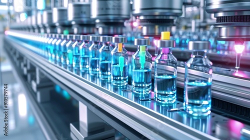 Drug manufacturing process. Conveyor with medical ampoules line at a modern pharmaceutical plant