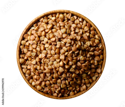 Dry food buckwheat grains in wooden bowl isolated on white.