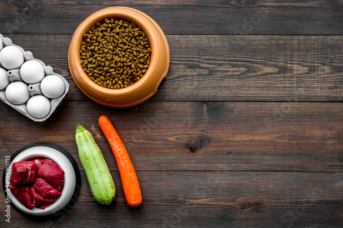 Dry food for dogs and cats based on raw meat and vegetables on dark wooden backgroud top view copy space