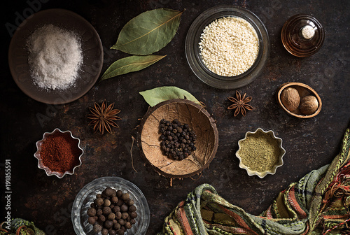 salt, pepper, bay leaf, sesame, nutmeg, star anise, coriander, allspice, paprika, sauce, ground, dry, spice, seasoning, dish, spoon, napkin, coconut, shell, metal, silver, surface, table, rust-eaten, scattered, black, white, green, red, yellow, burning, food, traditional, taste, delicious, kitchen, cookery, cooking, smell, scent, appetence, topview