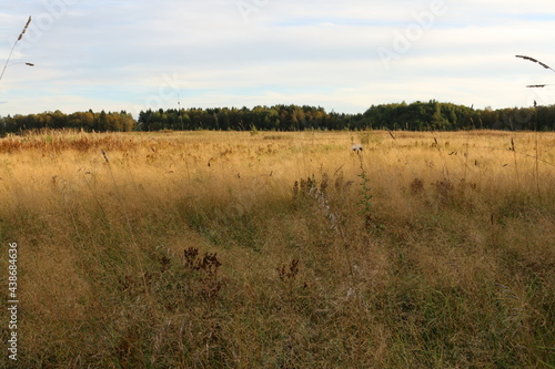 dry tall grass on the field. forest in the background. autumn, Russia