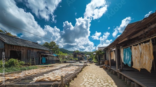 Drying Fish in a Rural Village Street Under a Blue Sky
