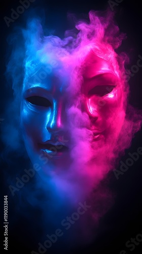 mask, face, smoke, two-story, 2, colours, blue, pink, neon, light, dark, mysterious, fantasy, art, digital, abstract, surreal, enigmatic, theatrical, performance, costume, occult, mystical, spiritual, duality, contrast, emotion, expression, character, identity, hidden, secret, enigma, dream, vision, vapour, cloud, glow, vibrant, colourful, dramatic, moody