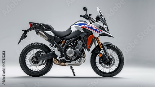 Dual-sport motorcycle side profile with off-road tires and high ground clearance on white background