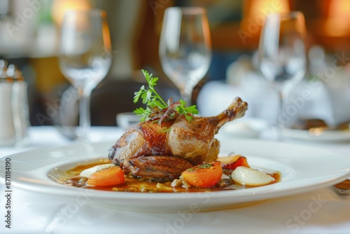 Duck confit served in restaurant on white plate