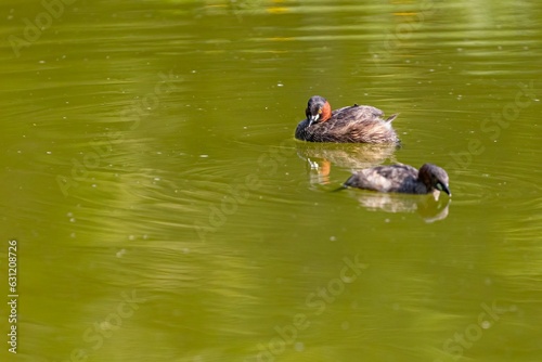 Ducks are gliding gracefully through a tranquil pond of emerald-colored water