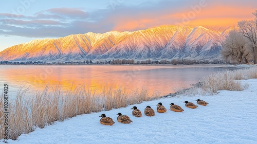 duck, lake, mountain, sunrise, snow, winter, glacé, water, nature, scenery, landscape, peaceful, calm, wildlife, bird, cold, frost, quiet, serene, beautiful, morning, dawn, golden hour