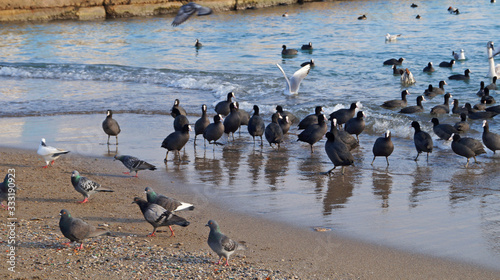 Ducks with black feathers and white swans swim on the coast of Feodosia on a winter clear day