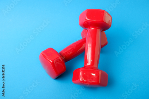 sport, dumbbell, red, plastic, fitness, gym, health, equipment, blue, physical exercise, copy space, exercise, aerobic, strong, weight, shape, concept, sportive, wellness, tool, blue background, background, minimalism, 2, lifting, athletic, small, many