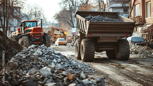 truck, dump, construction, site, gravel, road, dirt, vehicle, heavy, equipment, project, work, building, transport, haul, load, material, industry, engineering, shoveling, tractor, tire, wheel, stone, rock, ground, mud, brown, grey, black, orange, yellow, day, outdoors, street, city, urban, exterior, daytime, sunny