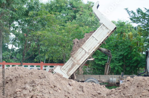 .Dump truck to soil to improve the soil. For construction
