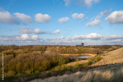 Dunes and view on Vlissingen city with sandy beach on sunset