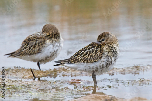 Dunlin (Calidris alpina), juvenile roosting, Windmill Farm NR, Cornwall, England, UK.