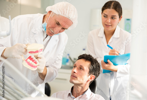 During appointment, mature man dentist and girl nurse communicates with male patient, shows model of jaws and explains mechanism of defect formation.