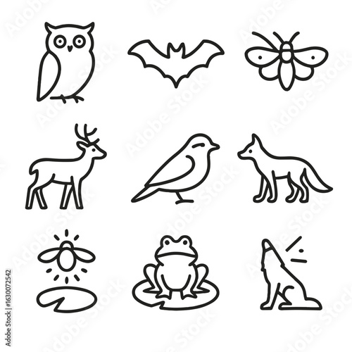 dusk, twilight, icon, outline, icon, set, wildlife, owl, silhouette, bat, flight, crepuscular, insect, cervid, edge, bird, fox, firefly, glow, depiction, frog, lily, pad, wolf, howling, line