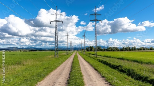 road, dirt, power, line, landscape, nature, sky, blue, outdoors, path, electricity, travel, rural, scenery, transportation, country, wire, journey, freedom, environment, view, sunlight, horizon, ground, countryside, connectivity, utility, energy, field, land, space, open, scenic, tranquil, peaceful, cable, natural, site, scene, beauty, exploration, adventure, backcountry, vista, unwinding, fresh, clear
