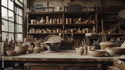 pottery, workshop, clay, studio, artisan, craft, tool, shelf, vessel, pot, bowl, jar, hand-made, ceramic, texture, design, art, artist, vintage, rustic, old, room, interior, table, work, creation, process, material, object, detail, background, still, life, brown, earth, dust, wheel, storage, space, traditional, shape, form, sculpture